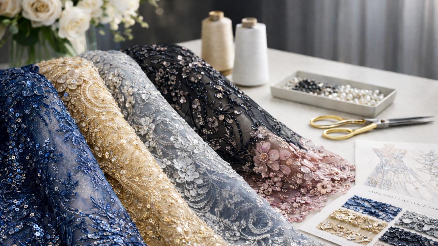 Browse lace fabrics, embroidery materials, trims, and appliqué components developed for real production use.